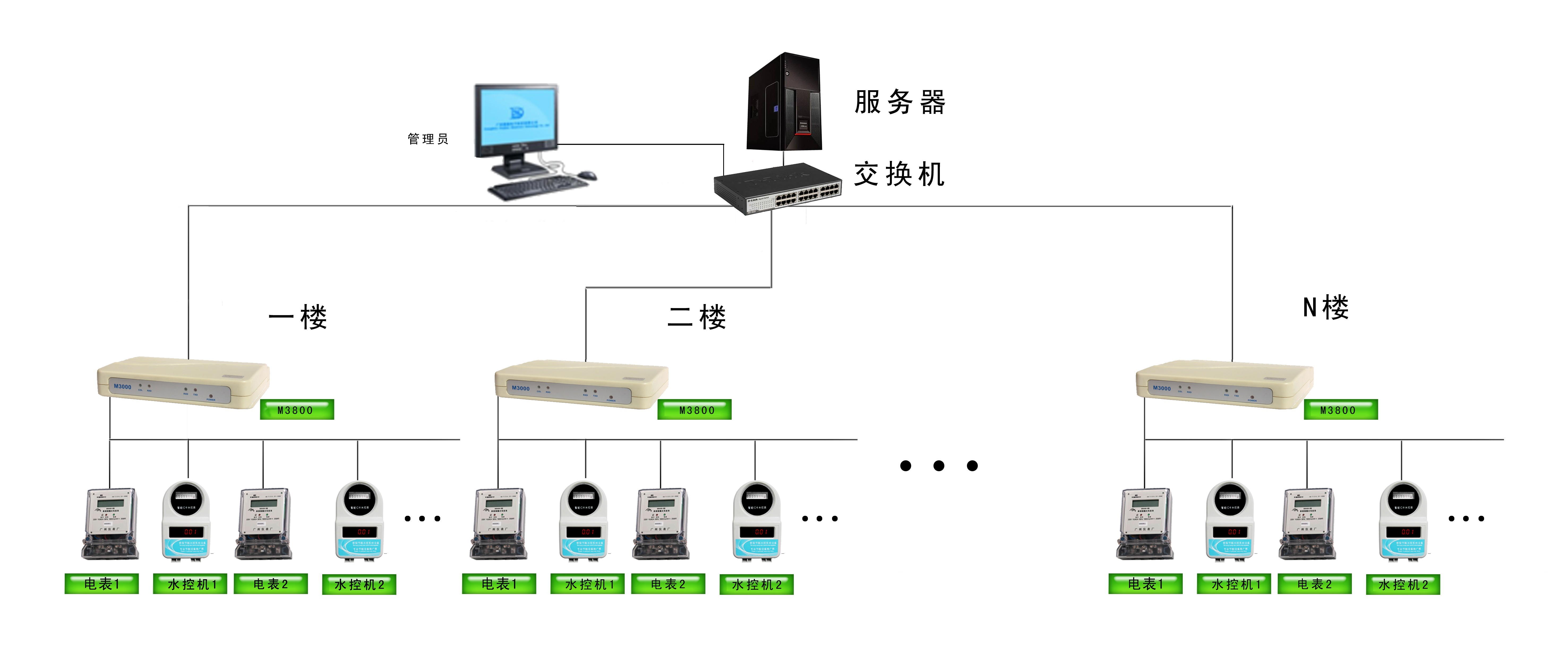 由于房間數量較多,而且分布在各個樓層,建議采用TCP/IP和485總線相結合的方式建設網絡,每個樓層配備一個網絡管控器,向上連接服務器通過內部局域網(即TCP/IP的方式),在樓層內采用485總線的方式連接水表和電表既節省網線架設的費用,又很清晰地分樓層管理,方便維護。